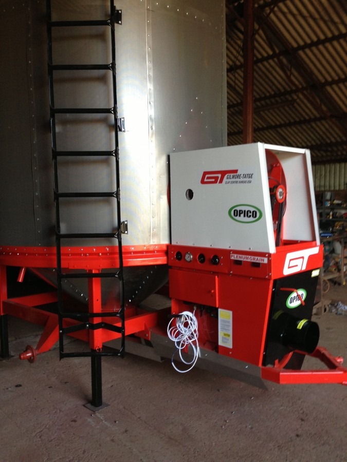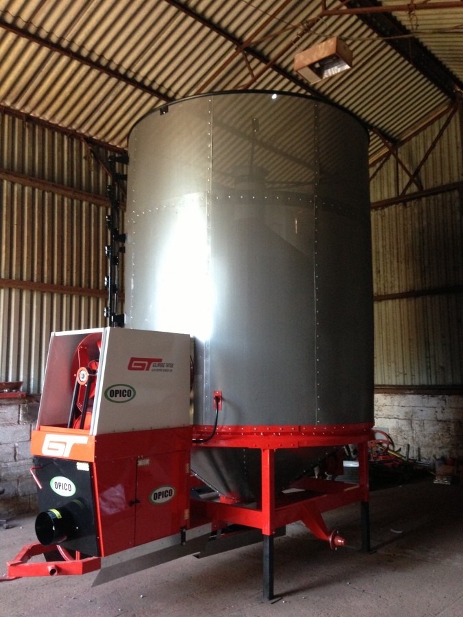 - Opico 9 ton grain drier fully reconditioned, with a new auger, main tube, bottom pan all bearings and belts replaced. All other parts have been checked or replaced. Comes with pre-cleaner and full 9ft fold down loading hopper. As new in appearance.